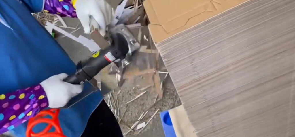 3. The chain of the machine will rotate at high speed after starting. Place the machine on the edge of the cardboard, and gently press the equipment on the edge of the sheets.